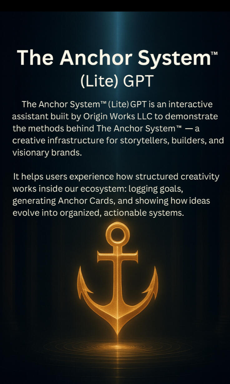 The Anchor System™Creative OS for storytellers, builders, and visionary brands.Developed by Origin Works LLC, The Anchor System™ is a modular creative framework designed to bring clarity, continuity, and canon to every story, brand, or organization.